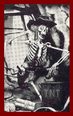 Well, well, your education continues: What can you do with Catalog Prop number 28 yee may ask ya' shifty deckhand? Take a look to the left. Bend the frame, change the hat, push in the face and fast as lighting a Cannon, the "Cowboy Skeleton" turns into a "Pirate". (complete with the now Token Rum Bottle!) |